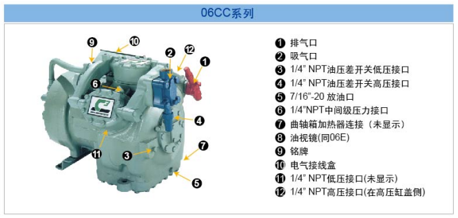 Carlyle 06CC系列为双级半封闭压缩机,将两级压缩集成于单台机体。通过板式热交换器(中冷器)实现级间冷却,适用于低温制冷工况。