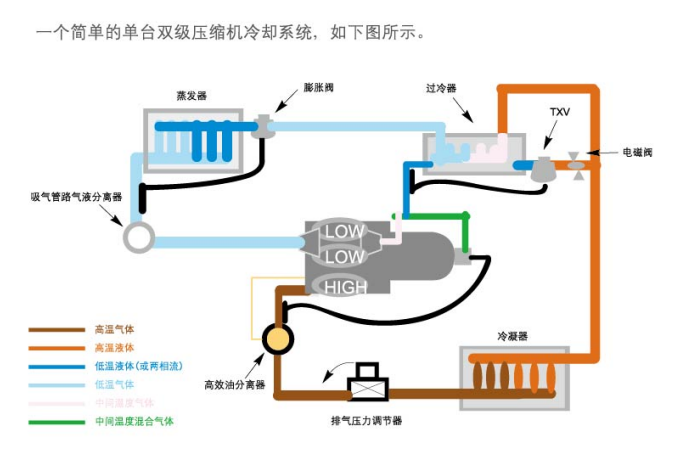 双级设计避免了压缩机在压力大幅变化时出现短路循环。冷量输出平稳,系统运行可靠。